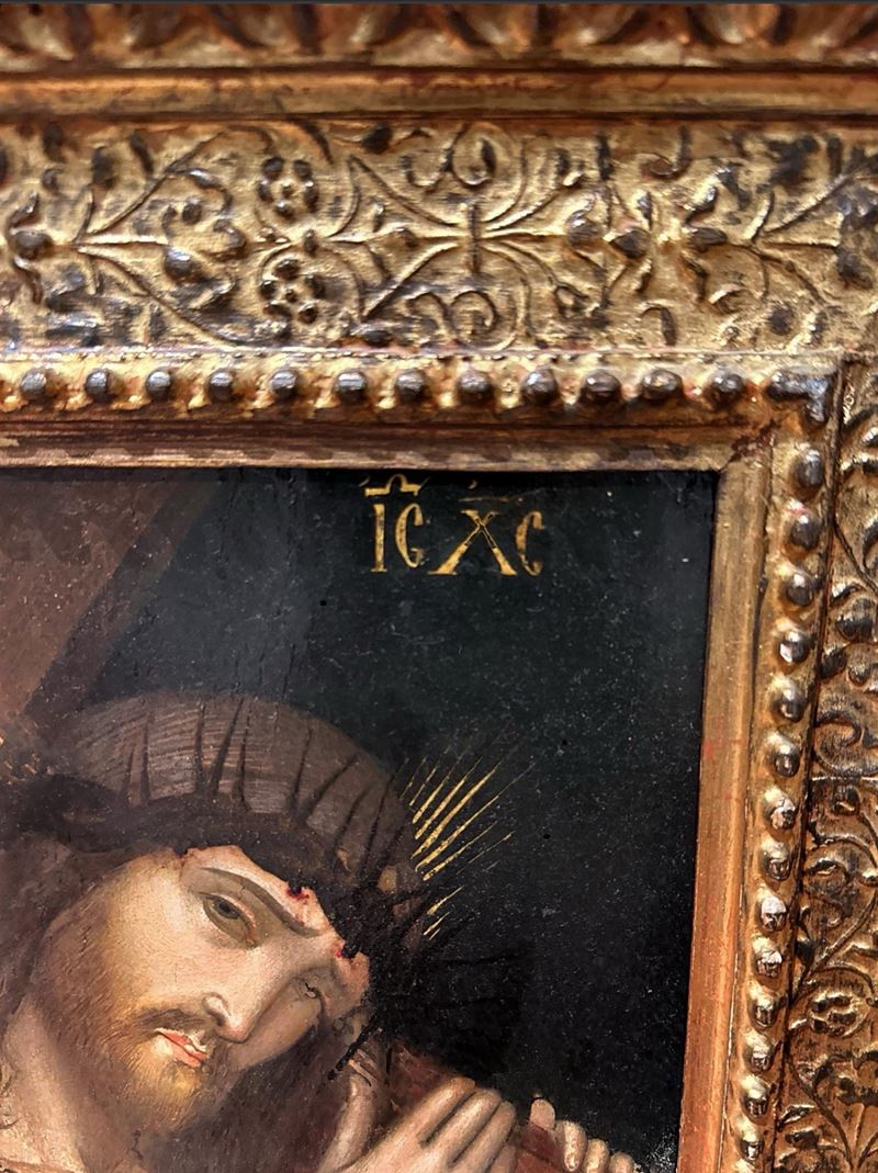 Maestro greco/dalmata del XVI - XVII secolo. "Cristo che regge la Croce". Tempera su tavola. Cm 37x29.