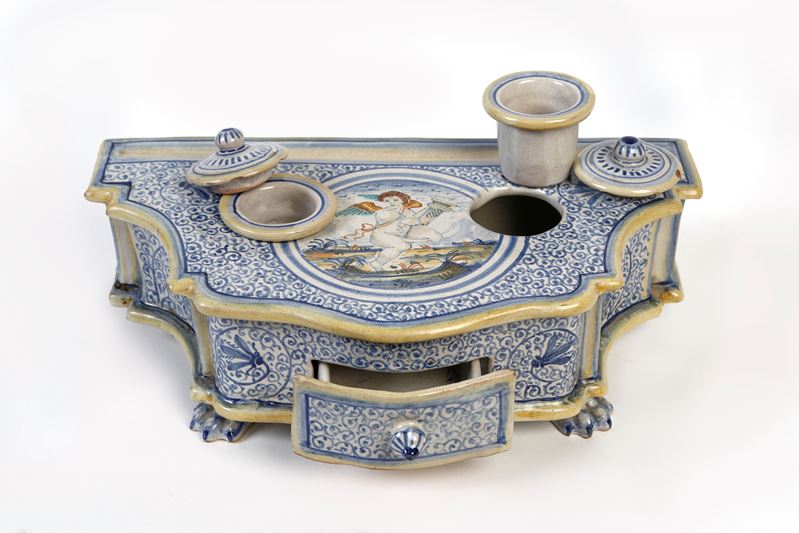 GIUSEPPE MARMOTTINI Calamaio in maiolica decorato in stile rinascimentale. metà del XX secolo, Italia. Prod. Deruta, Italia. Cm Reca sotto la base firma G. Marmottini Deruta.