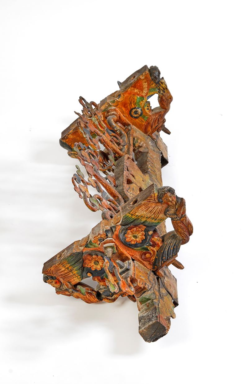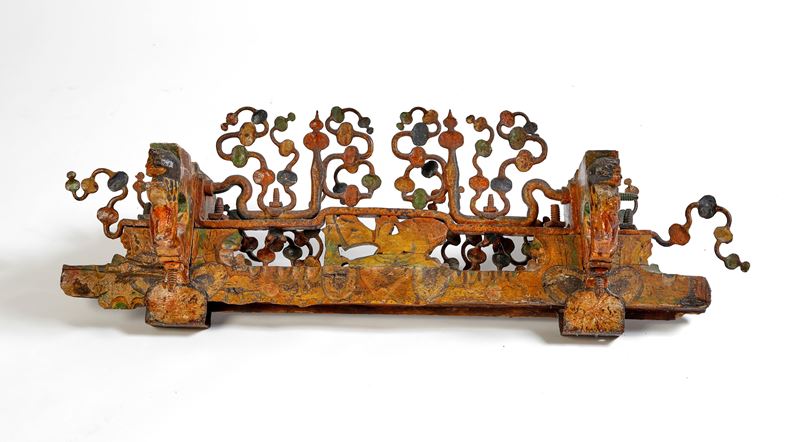 Fronte di carretto siciliano in legno intagliato e patinato a policromia con figure alate a cavallo e motivi vegetali. XIX secolo. Cm 38x106x40.