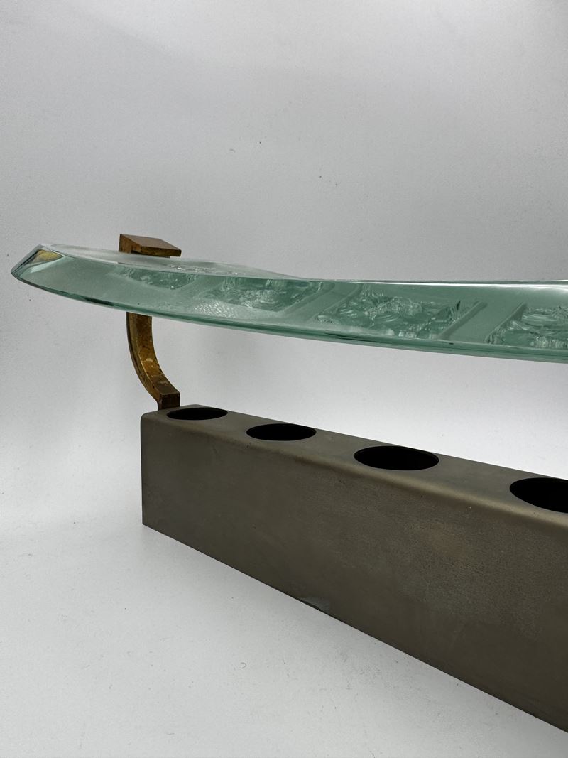 L'applique esemplifica la raffinata eleganza del design italiano degli anni Cinquanta. Realizzata in vetro curvo parzialmente smerigliato e cesellato da Duilio Bernabé, metallo cromato e ottone, mostra la meticolosa lavorazione artigianale per cui Fontana Arte è rinomata.