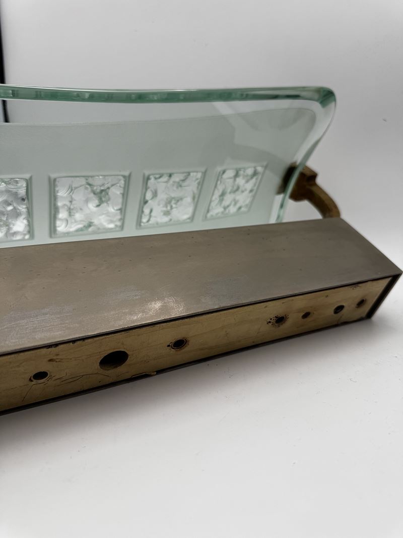 MAX INGRAND (Bressuire 1908 - Parigi 1969) Applique "1568" in vetro, metallo e ottone. Diffusori in vetro curvo e spesso, parzialmente satinato con 5 sezioni cesellate in ciascuno. 1956. Prod. Fontana Arte, Italia. Cm 19x60x22.