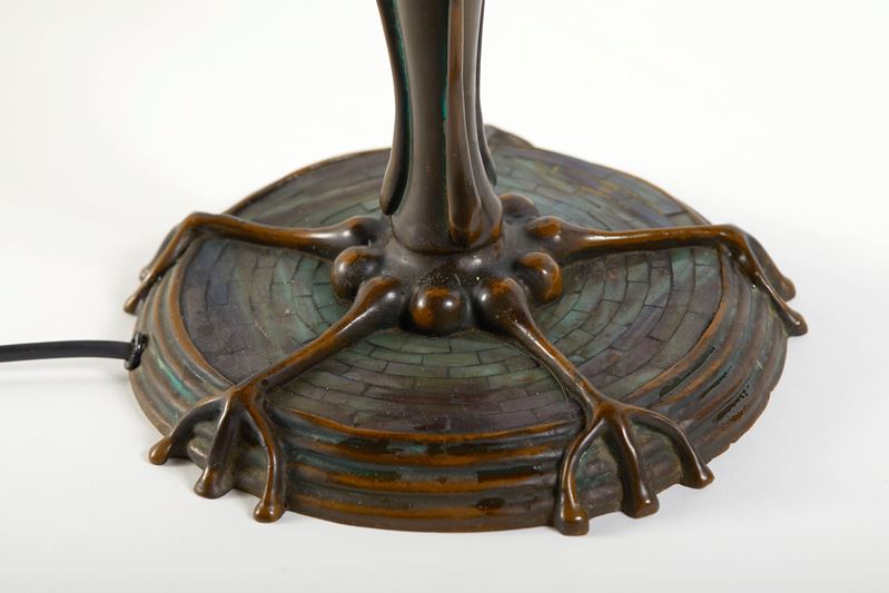 Lampada modello Tiffany con base in stile liberty in ottone e paralume a vetro cloisonné. XX secolo. Cm 47x40.
