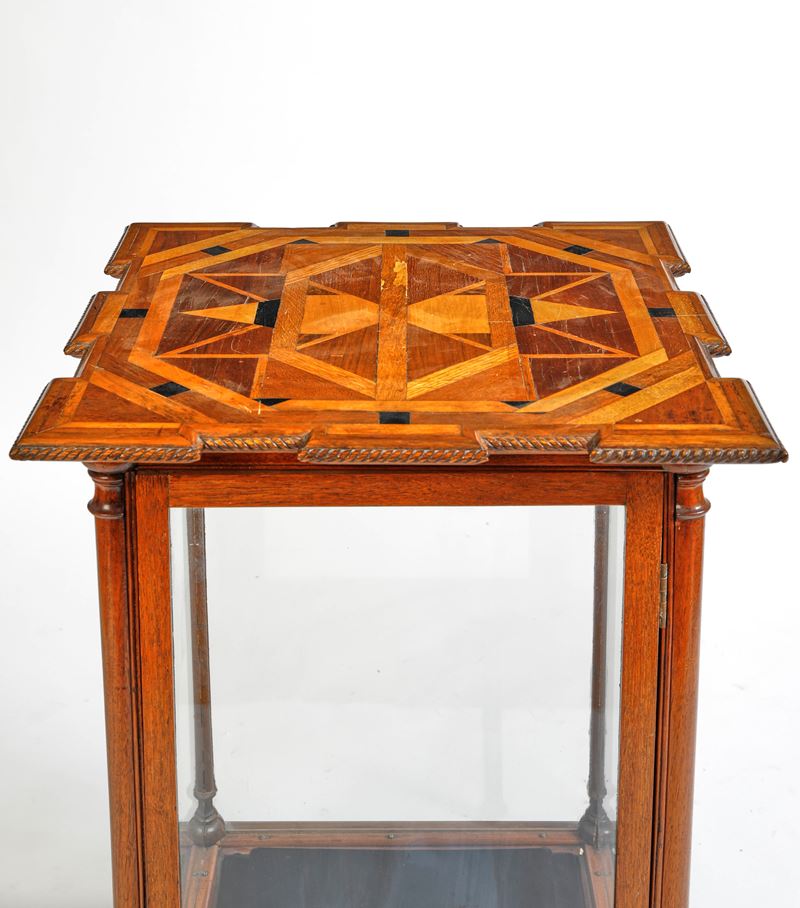 Mobiletto espositore in legno con ante in vetro. Piano in legno intarsiato. XX secolo. Cm 86x54x54.