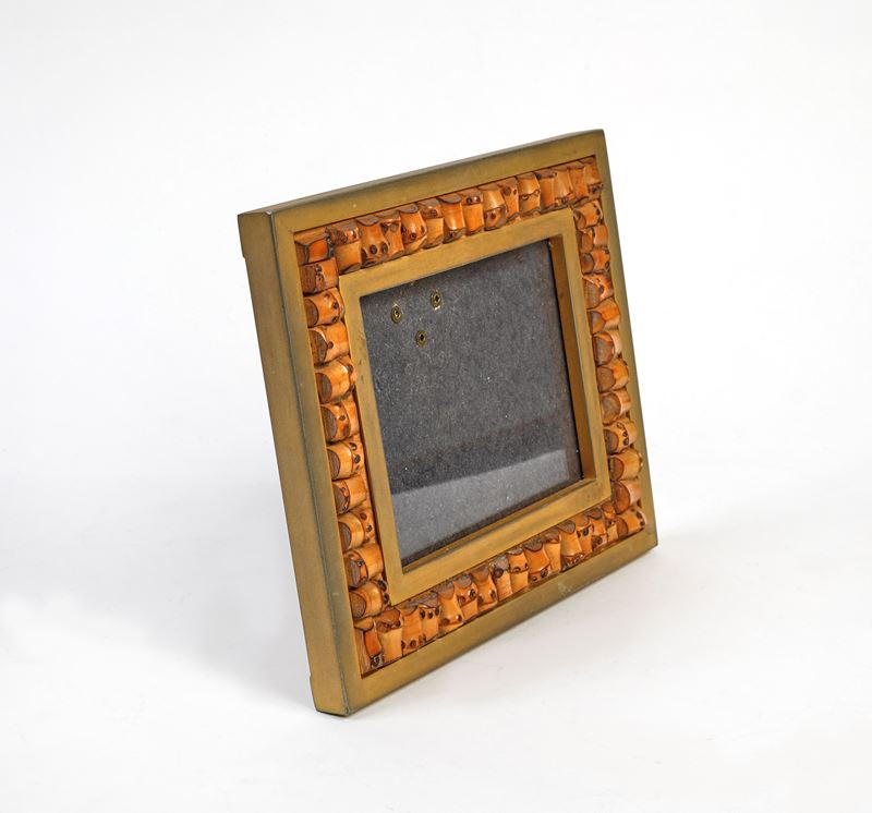 Portafoto in ottone e bamboo. XX secolo. Cm 18x20,5.