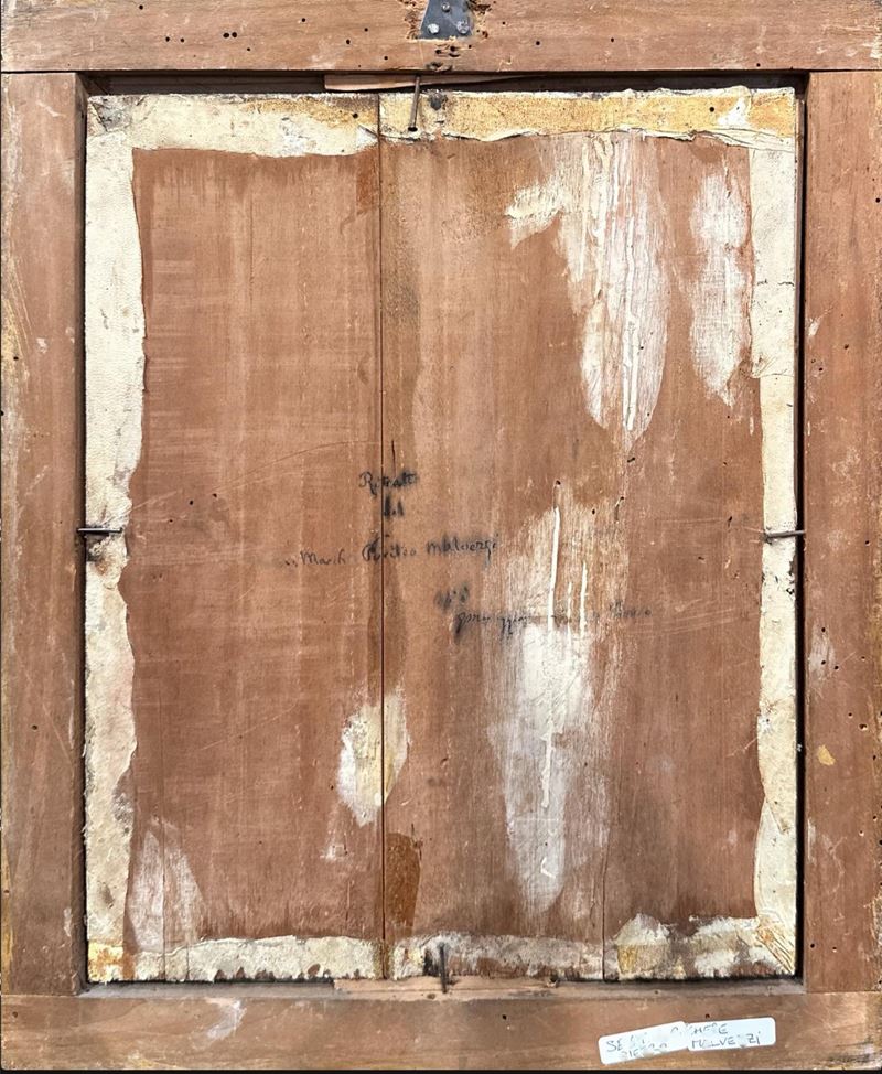 Maestro del XVIII secolo. "Ritratto del Marchese P. Malvezzi". Acquerello su carta applicata su tavola. Cm 30x26. Al retro reca titolo.