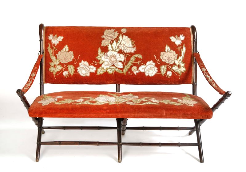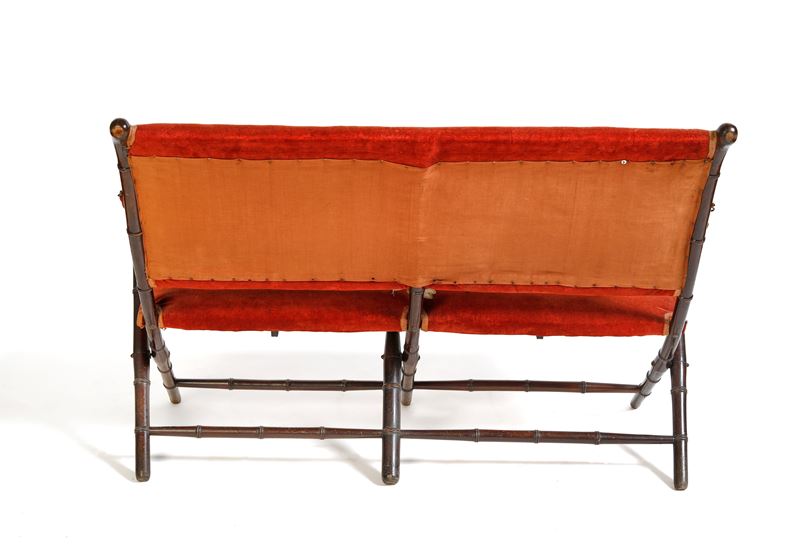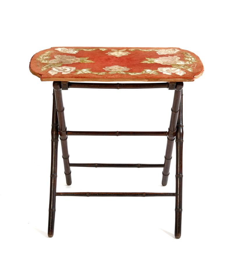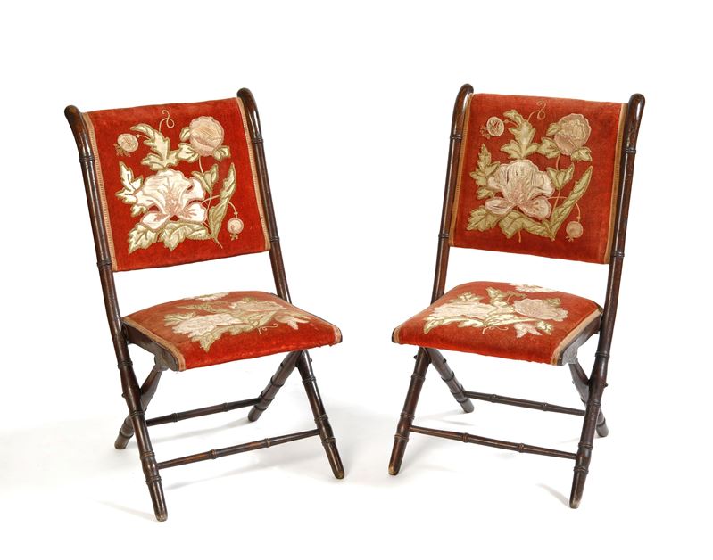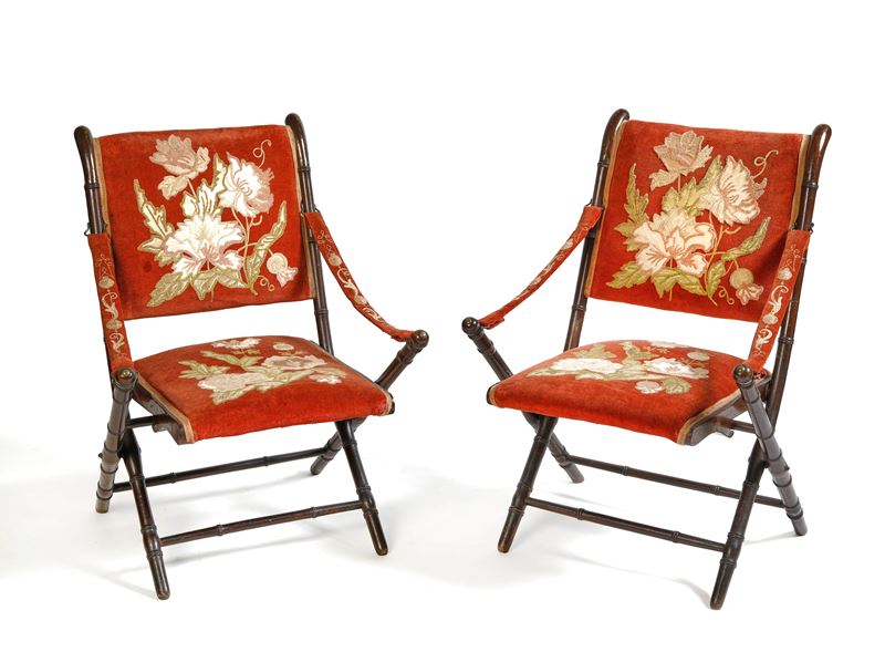 Salottino da pic nic da carrozza. Set composto da un divanetto, due poltroncine, due sedie e un tavolino pieghevoli. Realizzate in legno e velluto rosso ricamato. Napoli, XIX secolo. Cm divano: 80x130x65; poltroncine: 86x50x60; sedie: 80x45x54; tavolino: 80x70x47. (lievi difetti)