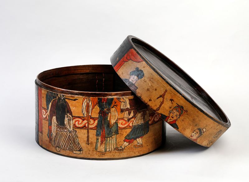 Scatola cinese in legno decorata con immagini popolari. Cm 23x36.