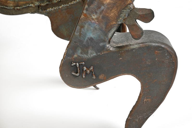 Scrivania eclettica realizzata a mano in ferro battuto. Reca le iniziali JM sul piede destro. XX secolo. Cm 107x108x50. Sembra che la scrivania sia stata realizzata per la scenografia di uno dei film Batman.