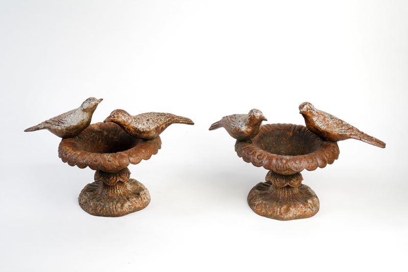 Lotto composto da sei ornamenti da giardino in ghisa che riproducono degli uccellini che si abbeverano a una fontana. XX secolo. Cadauno cm 20x30x22.