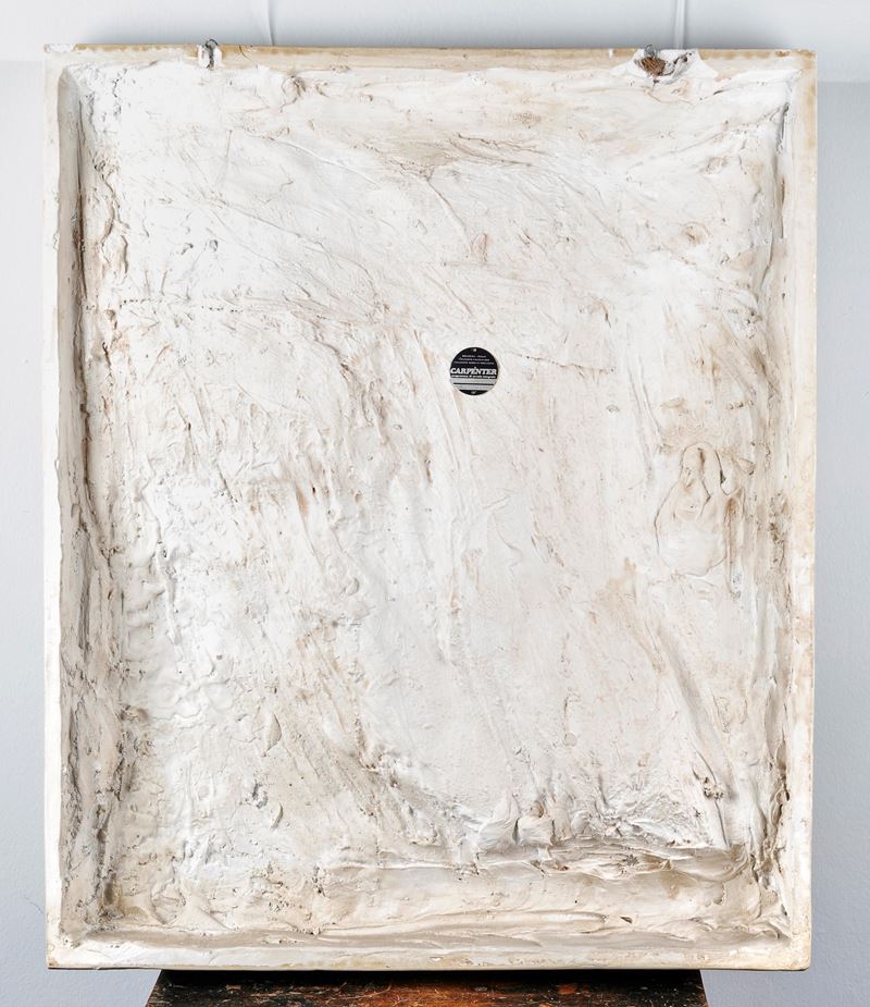 Calco in gesso raffigurante l'Ebrezza di Noè di Jacopo della Quercia (Porta Magna della Basilica di San Petronio, Bologna). XX secolo. Prod. Carpenter, Bologna. Cm 88x75x11. Al retro reca etichetta di produzione.