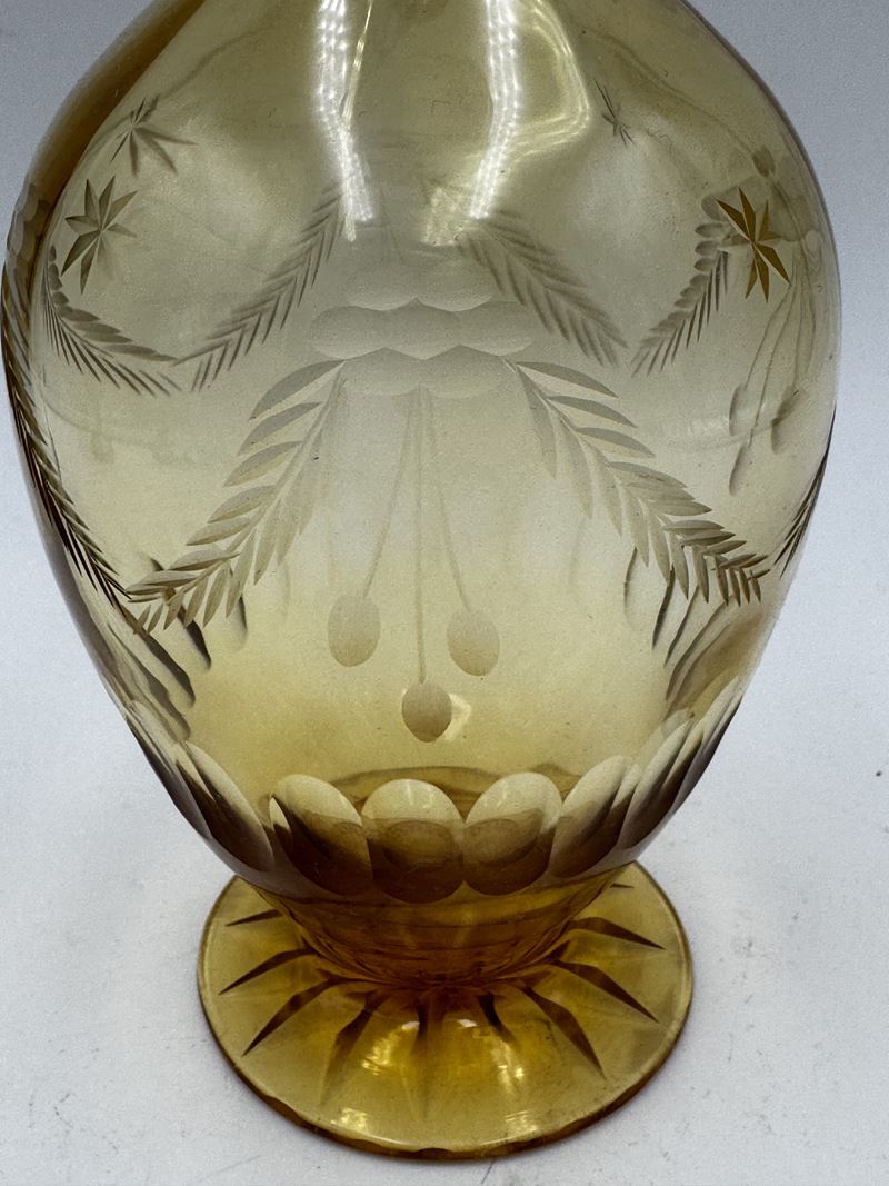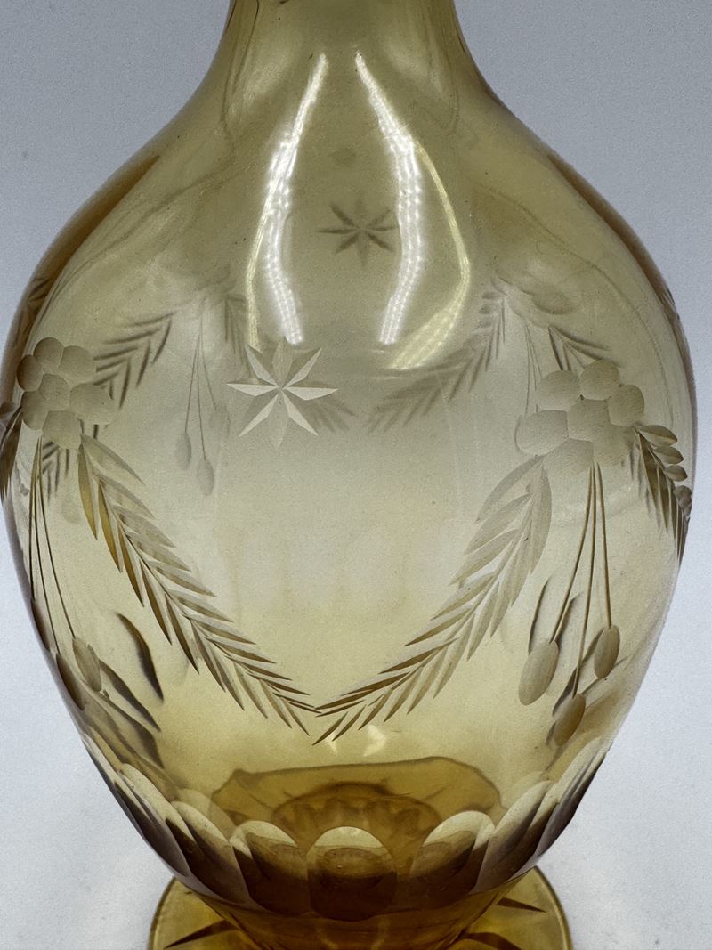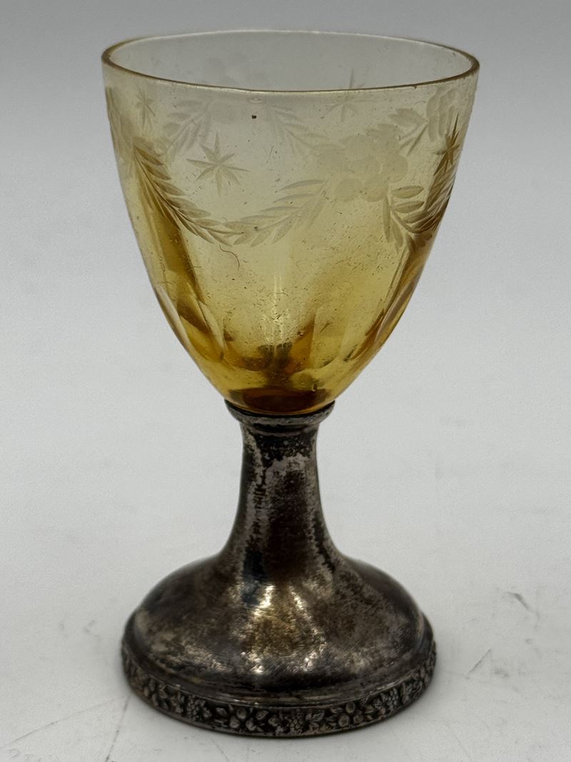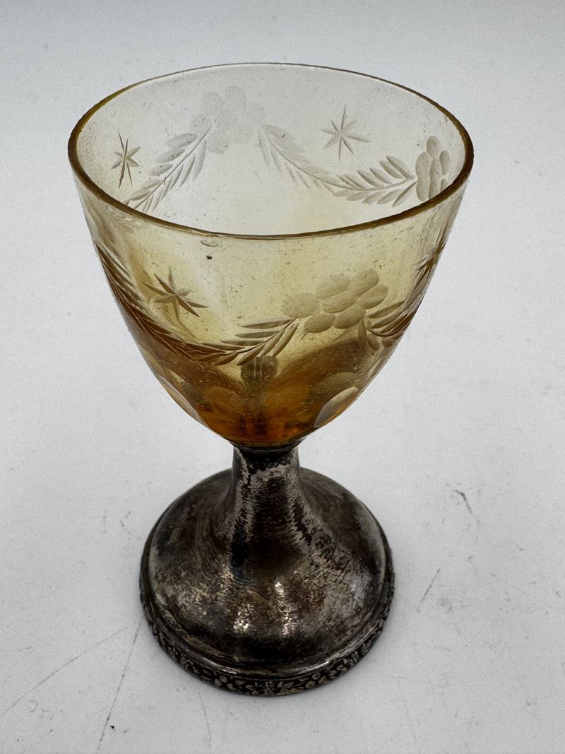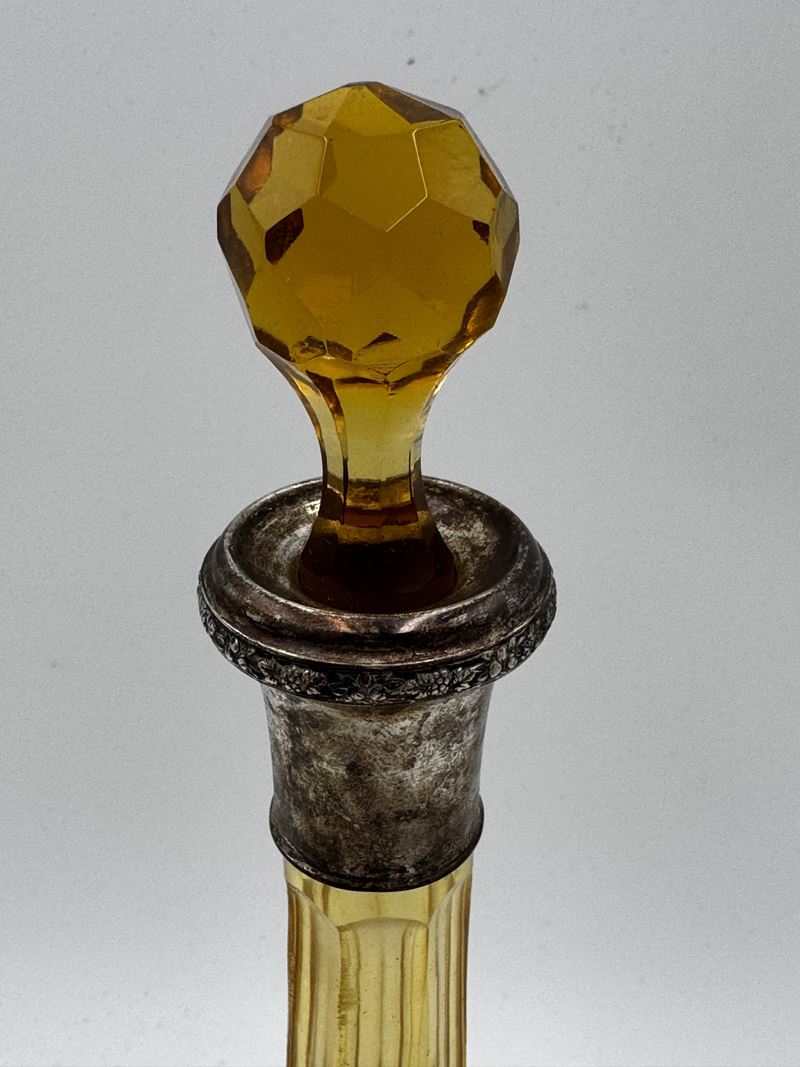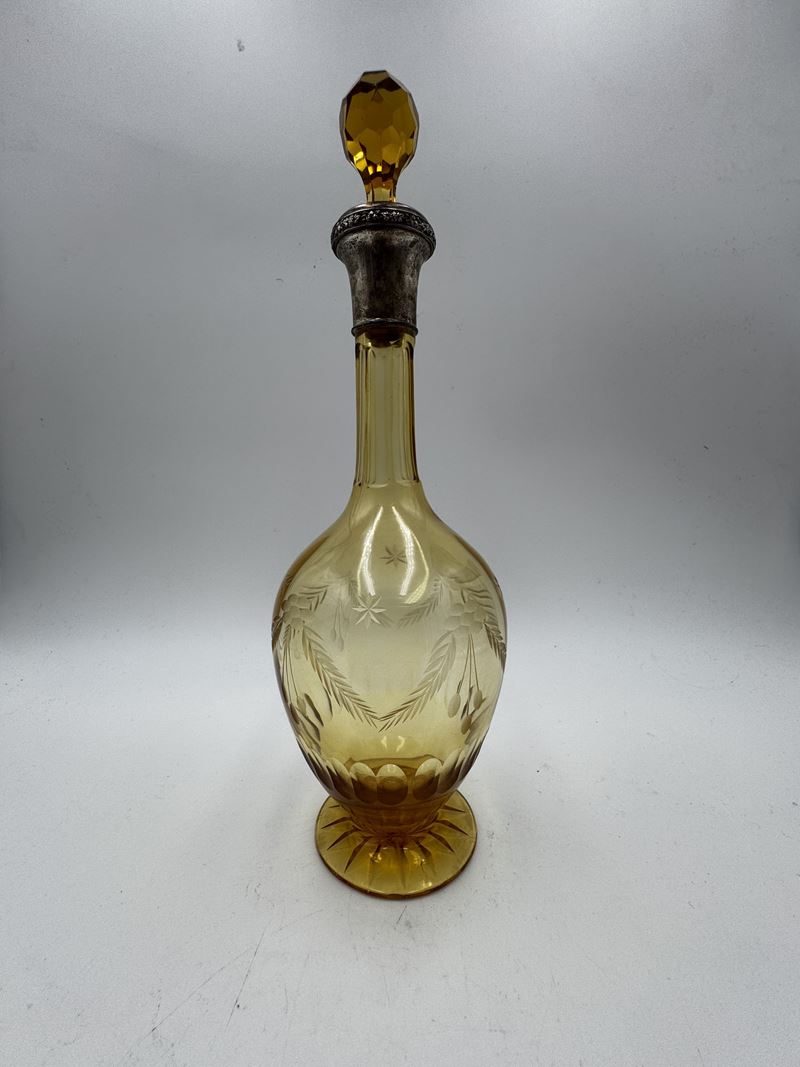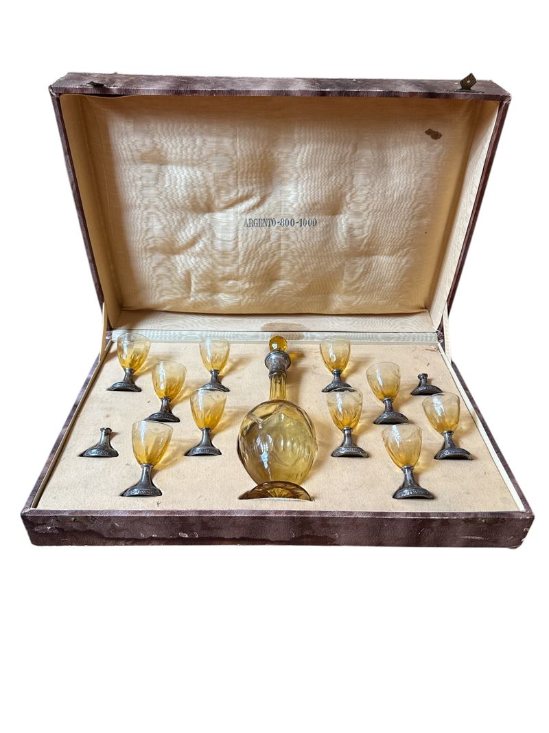Servizio di bicchieri da liquore con bottiglia in vetro ambrato molato e base in argento 800. Servizio con scatola originale, composto da 10 Bicchieri e bottiglia con tappo. XIX secolo, Italia.