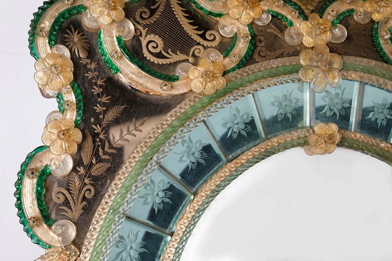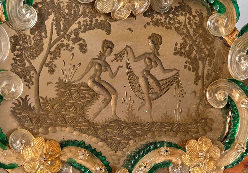 Specchiera in vetro colorato, inciso con decori e fiori in vetro applicati a rilievo. Metà del XX secolo. Cm 90x56. (difetti)