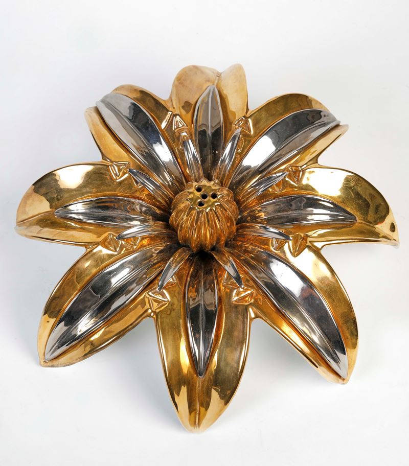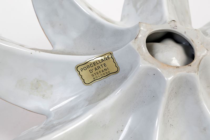 STEFANI, Bologna. Incensiere in porcellana smaltata oro e argento. XX secolo, Italia. Cm 9x30. Sotto la base reca etichetta Porcellane d'arte Stefani, Bologna. (lievi difetti)