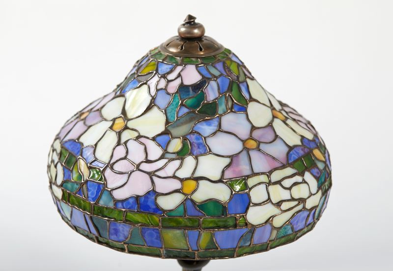 Lampada in argento 925 con paralume in vetro colorato ad effetto cloisonné