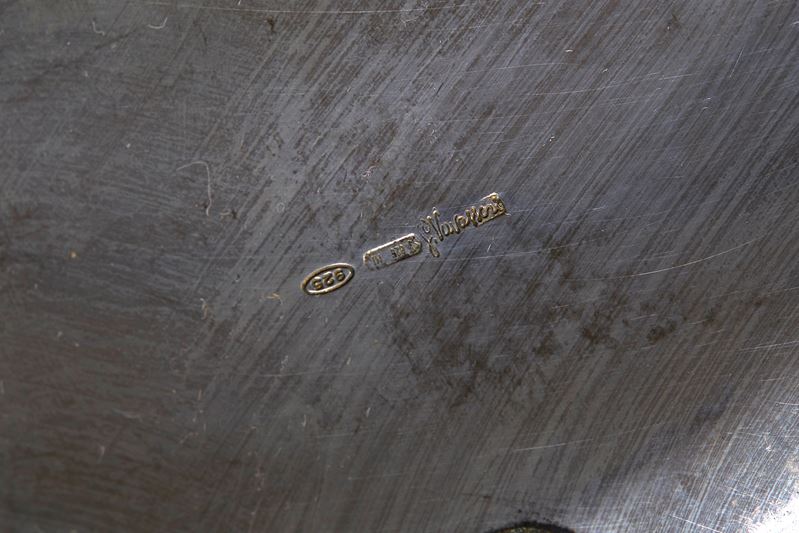 GIACOMO VAVASSORI Lampada in argento 925 con paralume in vetro colorato ad effetto cloisonné. 1970 circa. Cm: 45x26,5. Prod. Vavassori Argentiere, Milano. Sotto la base reca punzoni: G. Vavassori, 925.