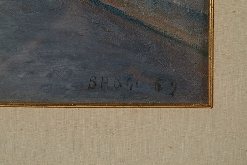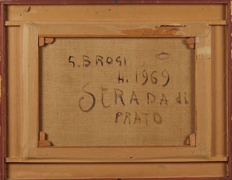 GINO BROGI (Prato 190 - 1989) "Strada di Prato", 1969. Olio su tela. Cm 40x53,5. Opera firmata e datata in basso a destra Brogi 69. Al retro opera firmata, datata e intitolata G. Brogi, 1969, Strada di Prato. Al retro reca timbro della Galleria d'Arte Farsetti di Prato.