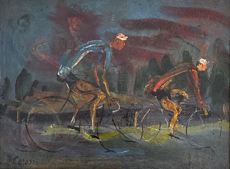 NINO CORRADO CORAZZA (Bologna 1897 - Bologna 1975) "Ciclisti". Olio su tela. Cm 30x40. Opera firmata in basso a sinistra Corazza.