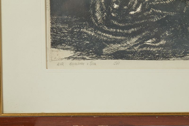 LUCIANO DE VITA (Ancona 1929 - Bologna 1992) "Senza titolo", 1960. Acquaforte su carta. Cm lastra: 39,5x47. Opera firmata e datata in basso a sinistra de Vita 1960. Reca numeri di tiratura in basso a destra prova di stampa.