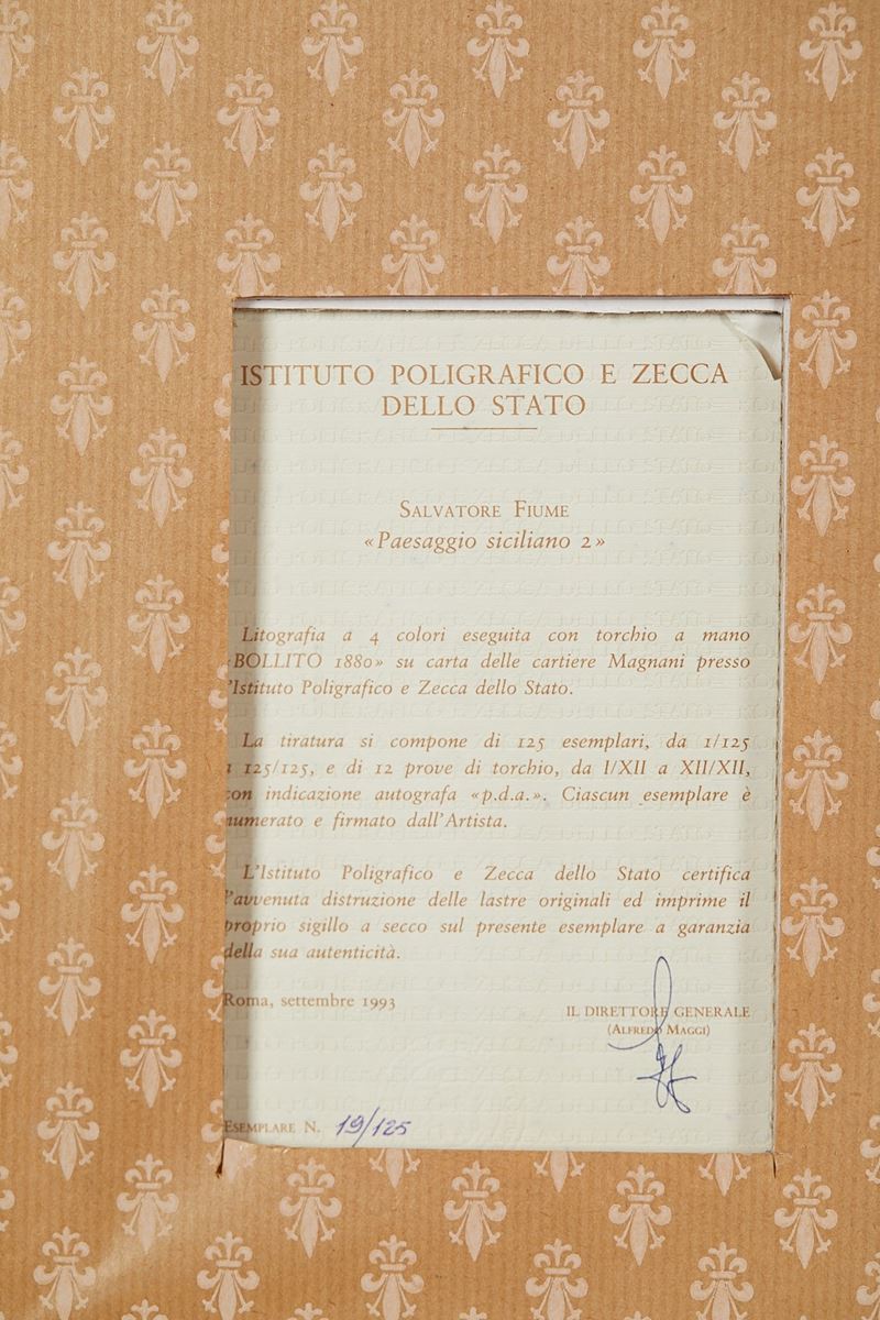 SALVATORE FIUME (Comiso 1915 - Milano 1997) "Paesaggio siciliano". Litografia a colori su carta. Cm foglio: 60x80. Opera firmata in basso a destra Fiume. Reca numeri di tiratura in basso a sinistra 19/125. Al retro reca etichetta di autentcità dell'Istituto Poligrafico e Zecca dello Stato, con firma del Direttore Generale Alfredo Maggi.