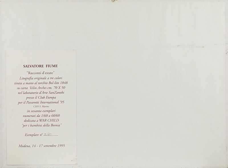 SALVATORE FIUME (Comiso 1915 - Milano 1997) "Racconti d'estate". Litografia a tre colori su carta. Cm 50x70. Opera firmata in basso a sinistra Fiume. Reca numeri di tiratura in basso a destra 5/60. Al retro reca etichetta Edizioni d'Arte San Zanobi, Modena.