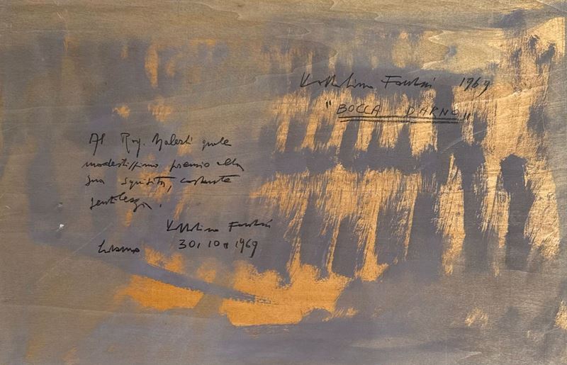 VOLTOLINO FONTANI (Livorno 1920 - 1976) "Bocca d'Arno", 1969. Olio su tavola. Cm 40x60. Opera firmata in basso a sinistra Voltolino Fontani. Opera firmata, datata e intitolata al retro Voltolino Fontanti 1969 Bocca d'Arno. Opera dedicata al retro.