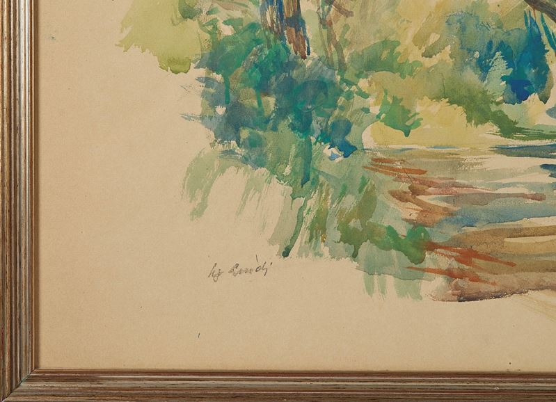 UGO GUIDI (Comacchio 1923 - Bologna 2007) "Paesaggio". Acquerello su carta. Cm 48x63,5. Opera firmata in basso a sinistra Ugo Guidi.