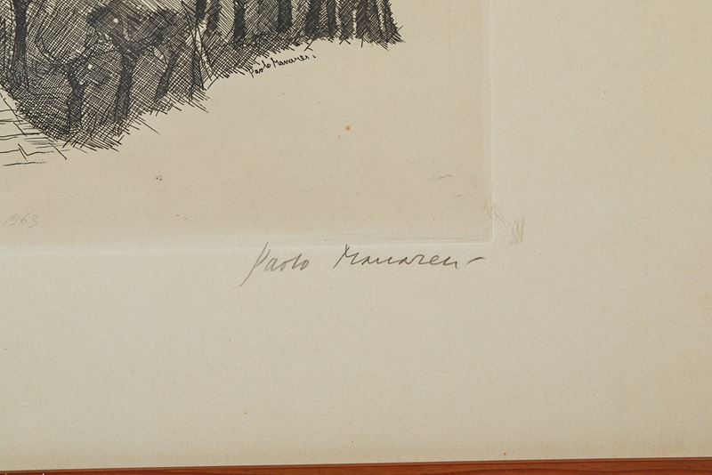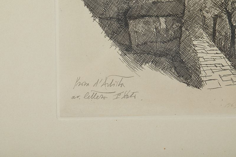 PAOLO MANARESI (Bologna 1908 - Bologna 1991) "Il cortile", 1963. Incisione su carta. Cm 50x70. Opera firmata in basso a destra Paolo Manaresi. Reca numeri di tiratura in basso a sinistra 6/30. Al retro reca etichetta Grafica Studio, Via Farini, Bologna.