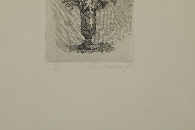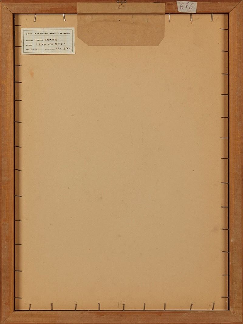 PAOLO MANARESI (Bologna 1908 - 1991) "Vaso con fiori". Incisione su carta. Cm 47,5x34. Opera firmata in basso a destra Paolo Manaresi. Reca numeri di tiratura in basso a sinistra 14/50. Al retro reca etichetta Galleria La Nuova Loggia Bologna.
