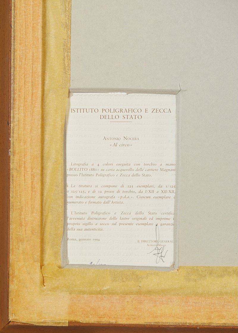 ANTONIO NOCERA (Caivano 1949) "Al circo". Litografia a quattro colori su carta. Cm foglio: 70x100. Opera firmata in basso a destra Nocera. Reca numeri di tiratura in basso a sinistra 20/150. Al retro reca etichetta di autentcità dell'Istituto Poligrafico e Zecca dello Stato, con firma del Direttore Generale Alfredo Maggi.