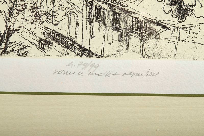 WALTER PIACESI (Ascoli Piceno 1929) “Urbino”, 1986. Incisione su carta. Cm lastra: 39x49. Opera firmata e datata in basso a sinistra Walter Piacesi 1986. Opera intitolata in basso a destra “Urbino”. Reca numeri di tiratura in basso al centro 79/99.
