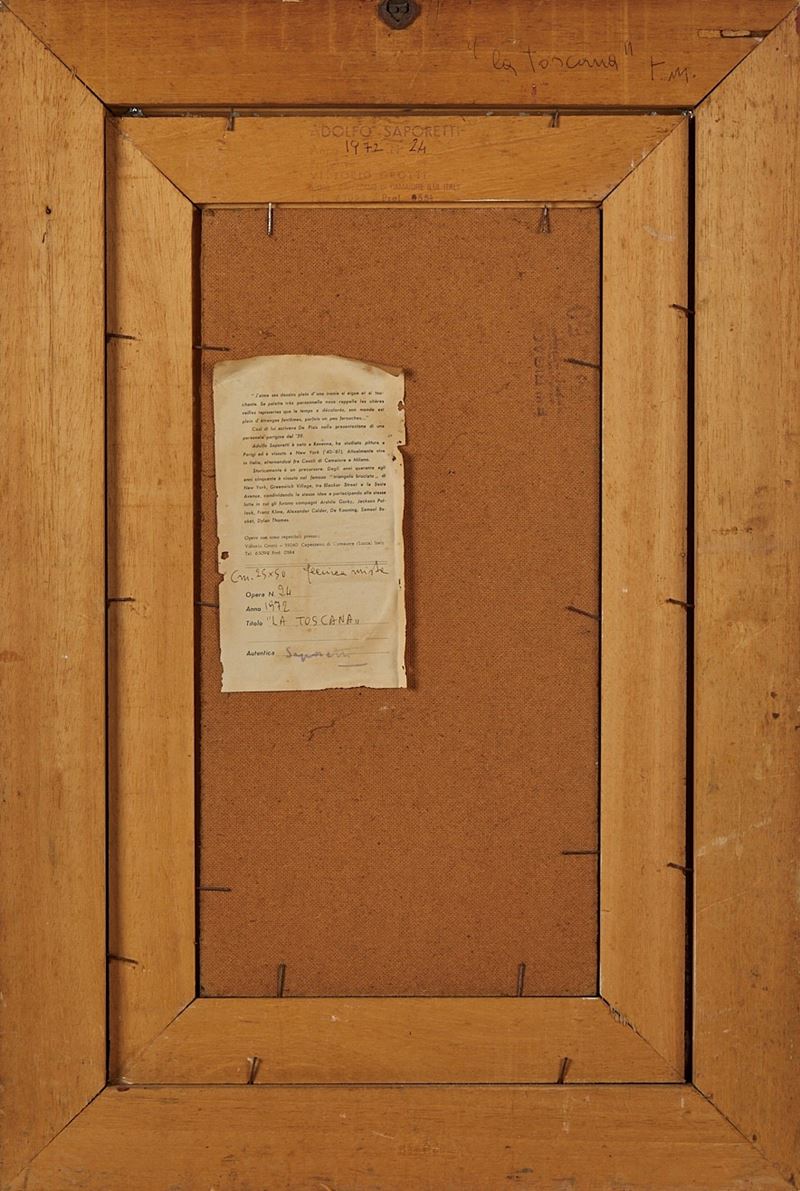 ADOLFO SAPORETTI (Ravenna 1907 - Milano 1974) "La Toscana", 1972. Tecnica mista su faesite. Cm 50x25. Opera firmata in basso al centro Saporetti. Al retro reca timbro ed etichetta del maestro Adolfo Saporetti.