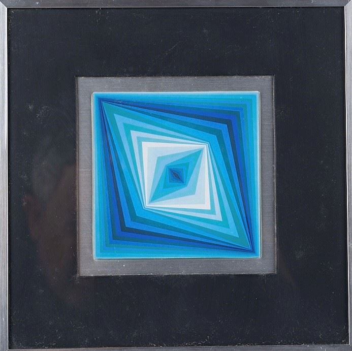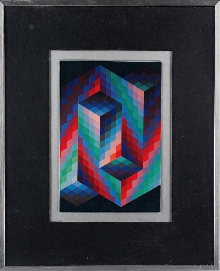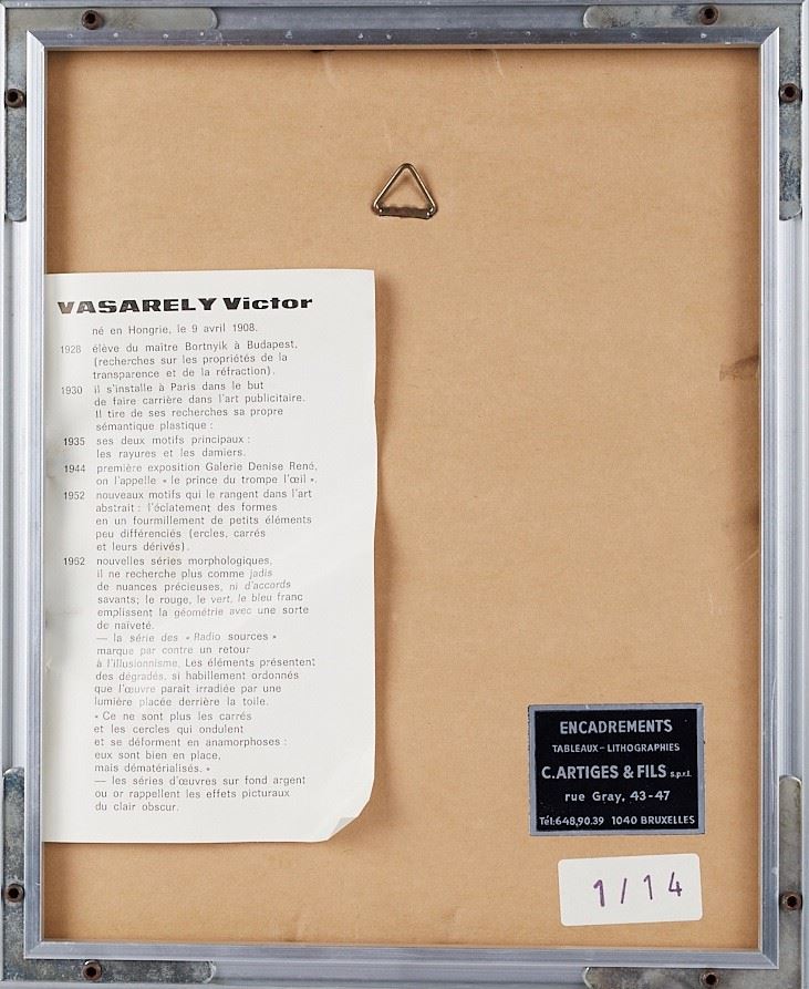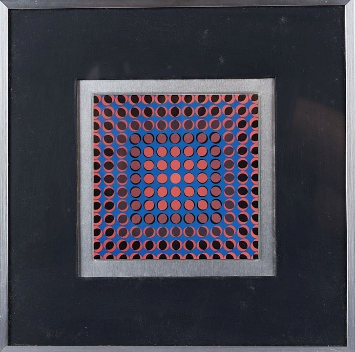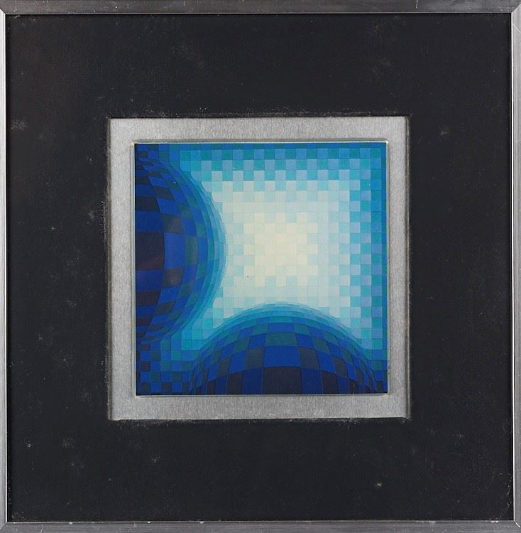VICTOR VASARELY (Pécs 1906 - Paris 1997) Lotto composto da 5 stampe offset su supporto metallico. Cm. da 10x10 a 14,5x9,5. In cornice cm. da 22x22 a 26x21,5. Al retro recano etichetta Encadrements, Artiges & Fils, Bruxelles. In scatola originale.