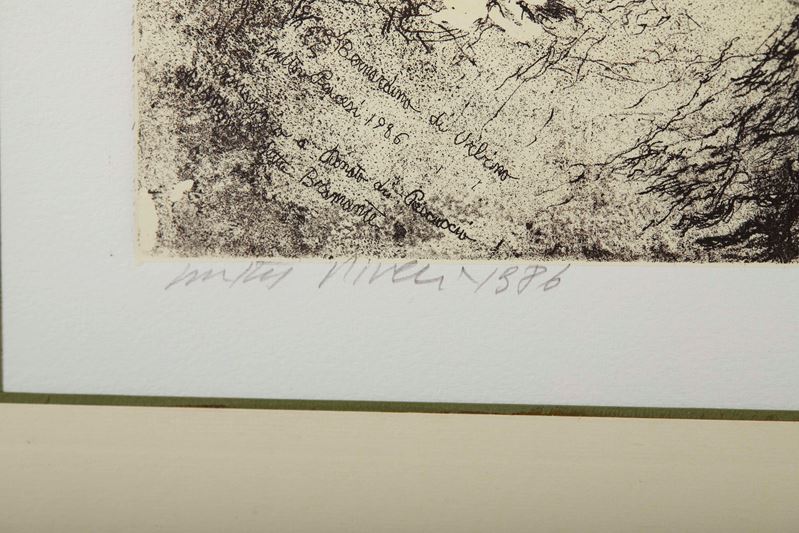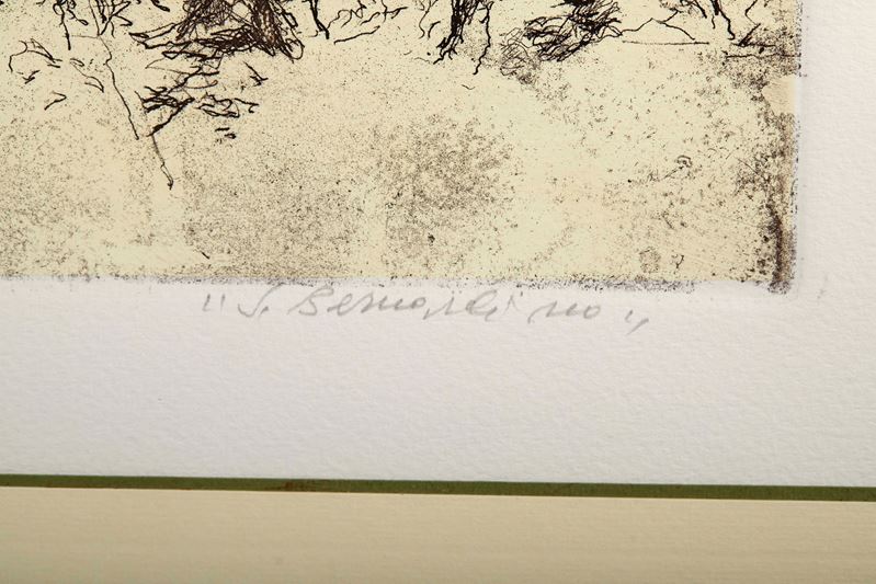 WALTER PIACESI (Ascoli Piceno 1929) “S. Bernardino”, 1986. Incisione su carta. Cm lastra: 40x49. Opera firmata e datata in basso a sinistra Walter Piacesi 1986. Opera intitolata in basso a destra “S. Bernardino”. Reca numeri di tiratura in basso al centro 79/99.