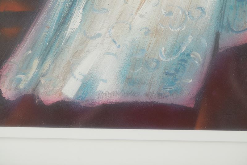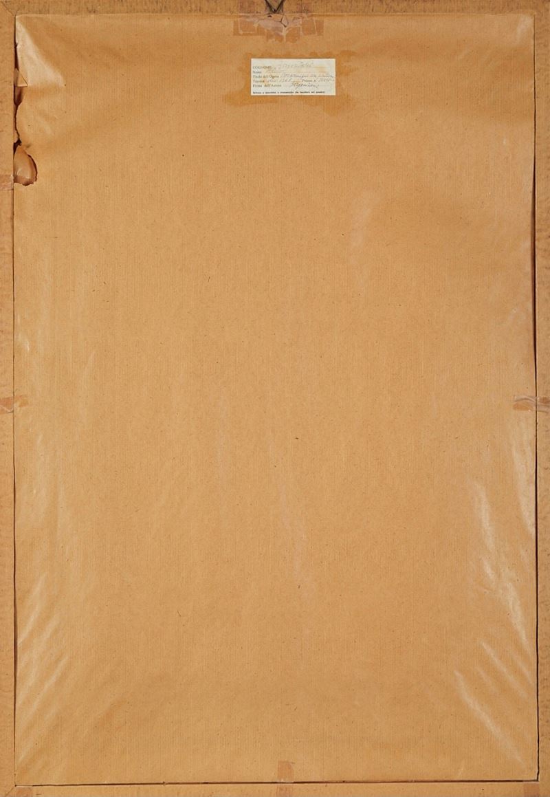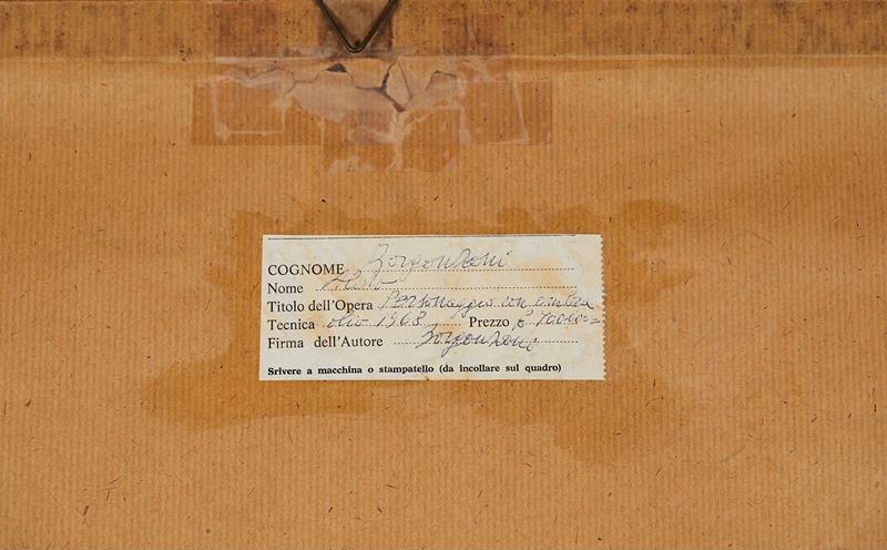 Aldo Borgonzoni (Medicina 1913 - Bologna 2004) "Personaggio con ombra", 1968. Olio su tavola. Cm 70x40. Opera firmata e datata in basso al centro Borgonzoni 1968.