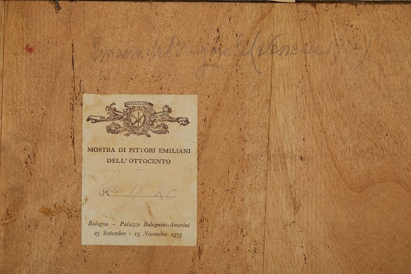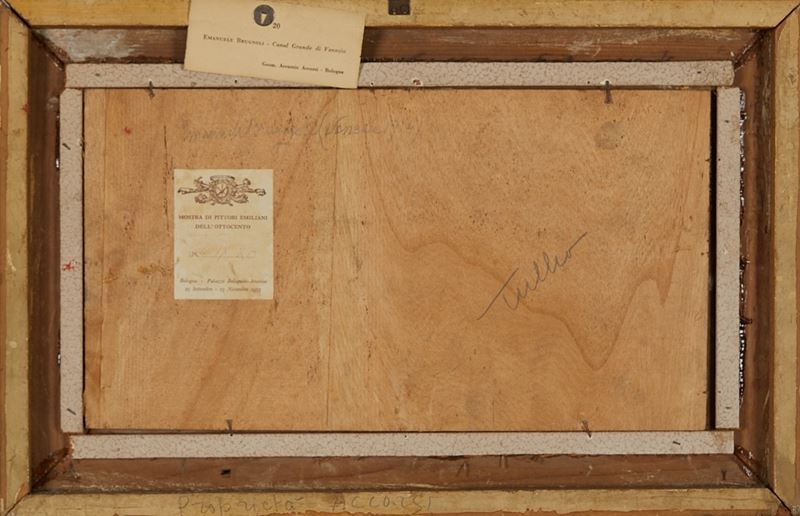 EMANUELE BRUGNOLI (Bologna 1859 - Venezia 1944) "Canal grande di Venezia". Olio su tela. Cm 19,2x35,2. Opera firmata in basso a destra Brugnoli. Al retro reca etichetta Mostra dei Pittori Emiliani dell'Ottocento, Bologna, Palazzo Bolognini - Amorini, 25 settembre - 15 novembre 1955. Al retro reca etichetta della Collezione Geometra Accursio Accorsi.