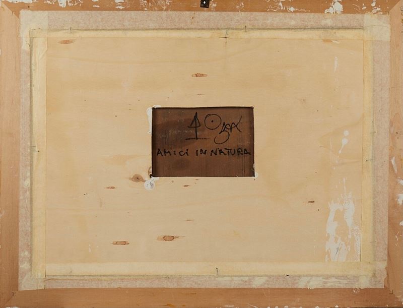 BRUNO CECCOBELLI (Montecastello di Vibio 1952) "Amici in natura". Olio e tecnica mista su tavola. Cm 31,5x46. Opera firmata e intitolata al retro Amici in Natura, BC.