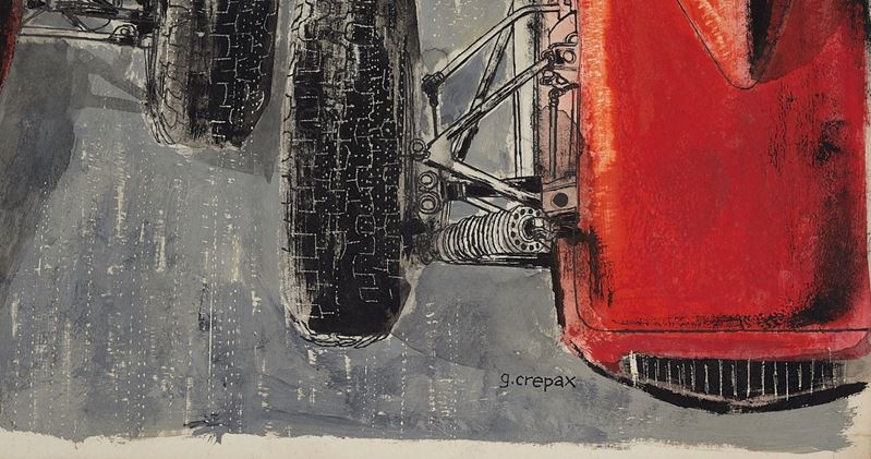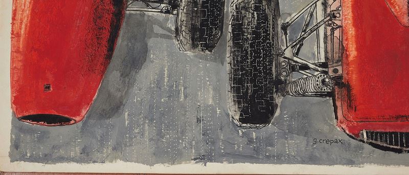 GUIDO CREPAX (Milano 1933 - Milano 2003) "Ferrari 156 F1 (Sharknose)", anni '60. Acquerello e matita su cartoncino. Cm 40,5x32. Opera firmata in basso a destra G. Crepax.