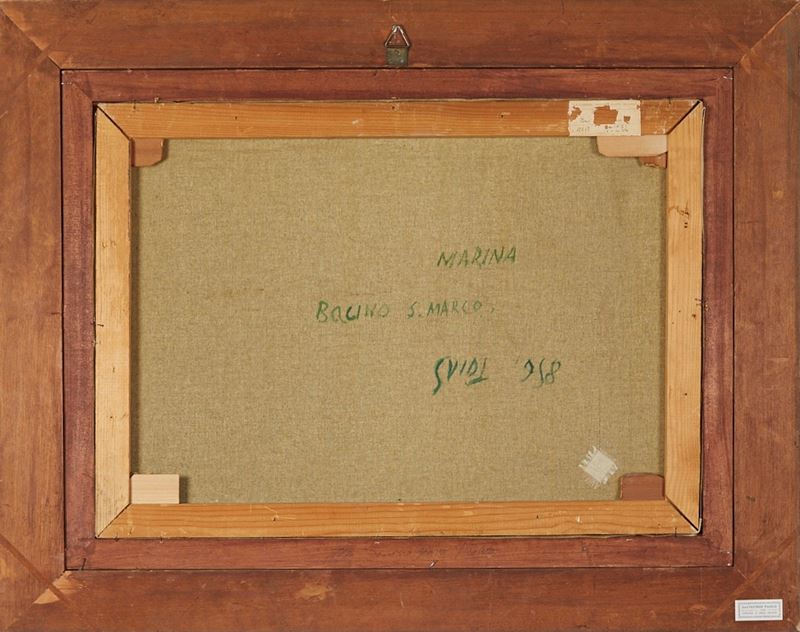 VIRGILIO GUIDI (Roma 1891 - Venezia 1984) "Bacino di San Marco", 1958. Olio su tela. Cm 50,5x70,5. Al retro opera intitolata, firmata e datata Bacino di San Marco, Guidi, 1958. Al retro reca etichetta della Galleria d'Arte La Loggia, Bologna.