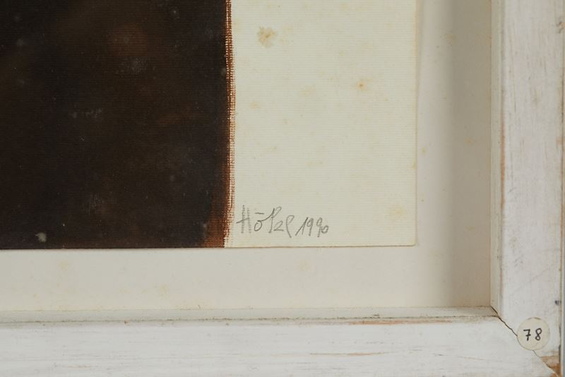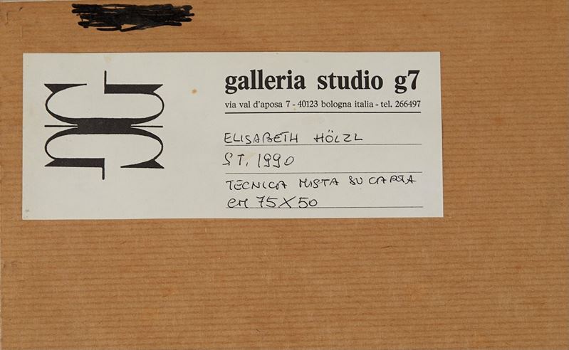 HOLTZ ELISABETH (Merano 1962) "Senza titolo", 1990. Tecnica mista e collage su carta. Cm 75x50. Opera firmata e datata in basso a destra Holtz 1990. Al retro reca etichetta Galleria Studio G7, Bologna.