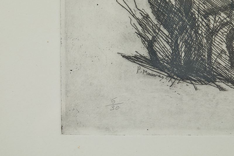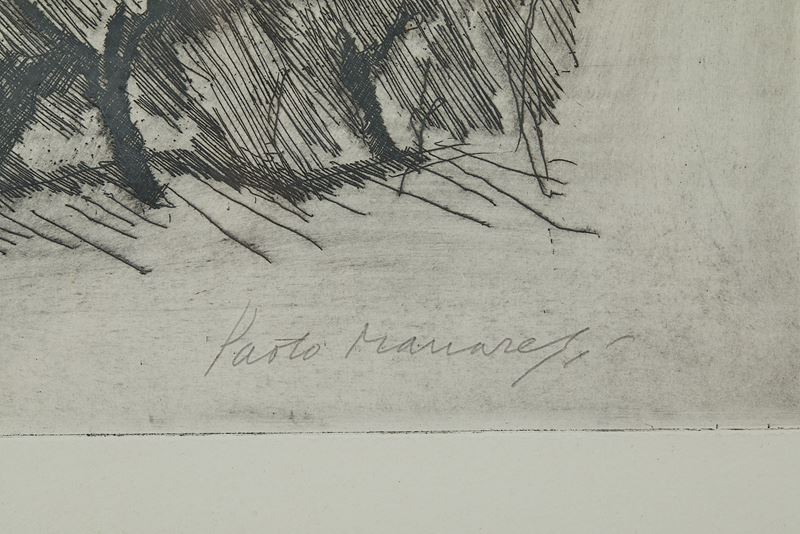 PAOLO MANARESI (Bologna 1908 - Bologna 1991) "Case dell'Appennino". Incisione su carta. Cm 50x70. Opera firmata in basso a destra Paolo Manaresi. Reca numeri di tiratura in basso a sinistra 6/30. Al retro reca etichetta Grafica Studio, Via Farini Bologna.