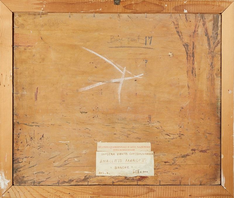 ANACLETO MARGOTTI "Barche". Olio su tavola. Cm 50x60. Al retro reca etichetta della Seconda Quadriennale d'Arte Nazionale Roma MCMXXXV. A. XII