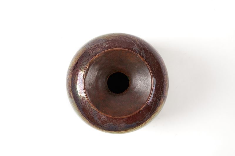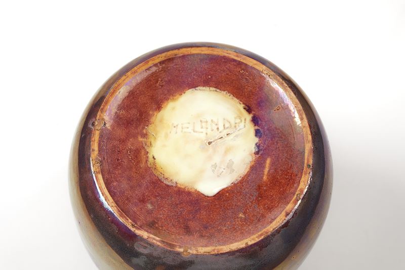 PIETRO MELANDRI (Faenza 1885 - Faenza 1976) Vaso in ceramica smaltata a lustro sui toni del porpora e dell'oro, con disegni floreali. Bocca rivestita in rame. Anni '40. Cm 23x17. Opera firmata sotto la base Melandri.