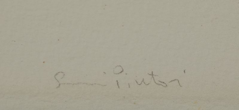 GIOVANNI PINTORI (Tresnuraghes 1912 - Milano 1999) "Autoritratto con chitarra e pensieri d'amore". Tecnica mista e acquerello su carta. Cm 23x15. Opera intitolata al centro. Opera firmata in basso al centro G. Pintori.