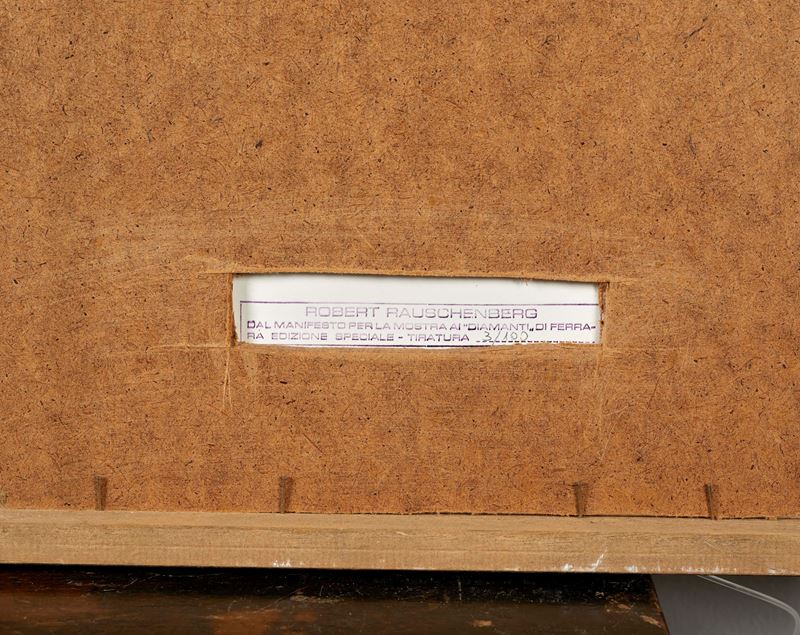 ROBERT RAUSCHENBERG (Port Arthur 1925 – Captiva Island 2008) “Jammer”, 1976. Litografia a colori su carta. Cm 100x70. Esemplare 3/100. Al retro reca etichetta Robert Rauschenberg, dal manifesto per la mostra Ai Diamanti di Ferrara, ed. speciale. Ed. Ginevra Grigolo - Studio G7, Bologna.