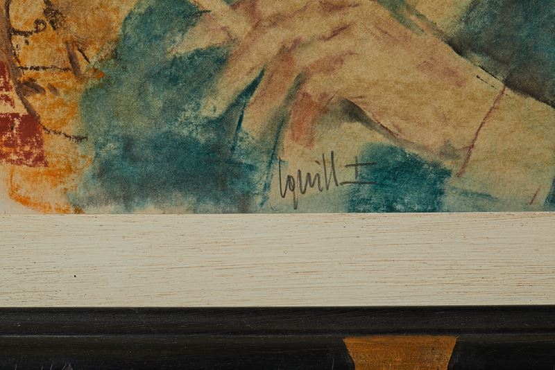 REMO SQUILLANTINI (Stia 1920 - Firenze 1996) "Figure". Tecnica mista su carta. Cm 34x50. Opera firmata in basso a sinistra Squillantini. Al retro reca timbro della Galleria d'Arte Contemporanea Davanzati, Firenze a firma del titolare, in data 1984.