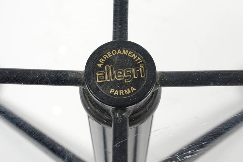 ALLEGRI Tavolino in metallo nero con inserto in vetro. Anni '70. Cm 56x70x42. Reca marchio Arredamenti Allegri Parma. (lievi difetti)