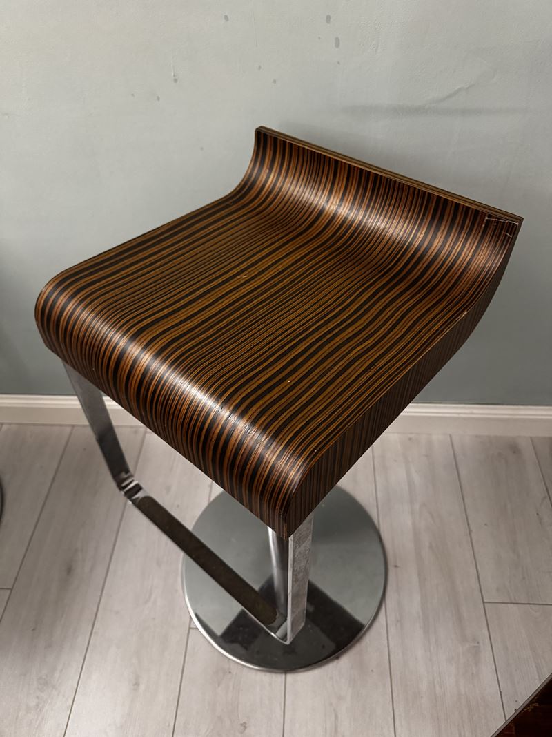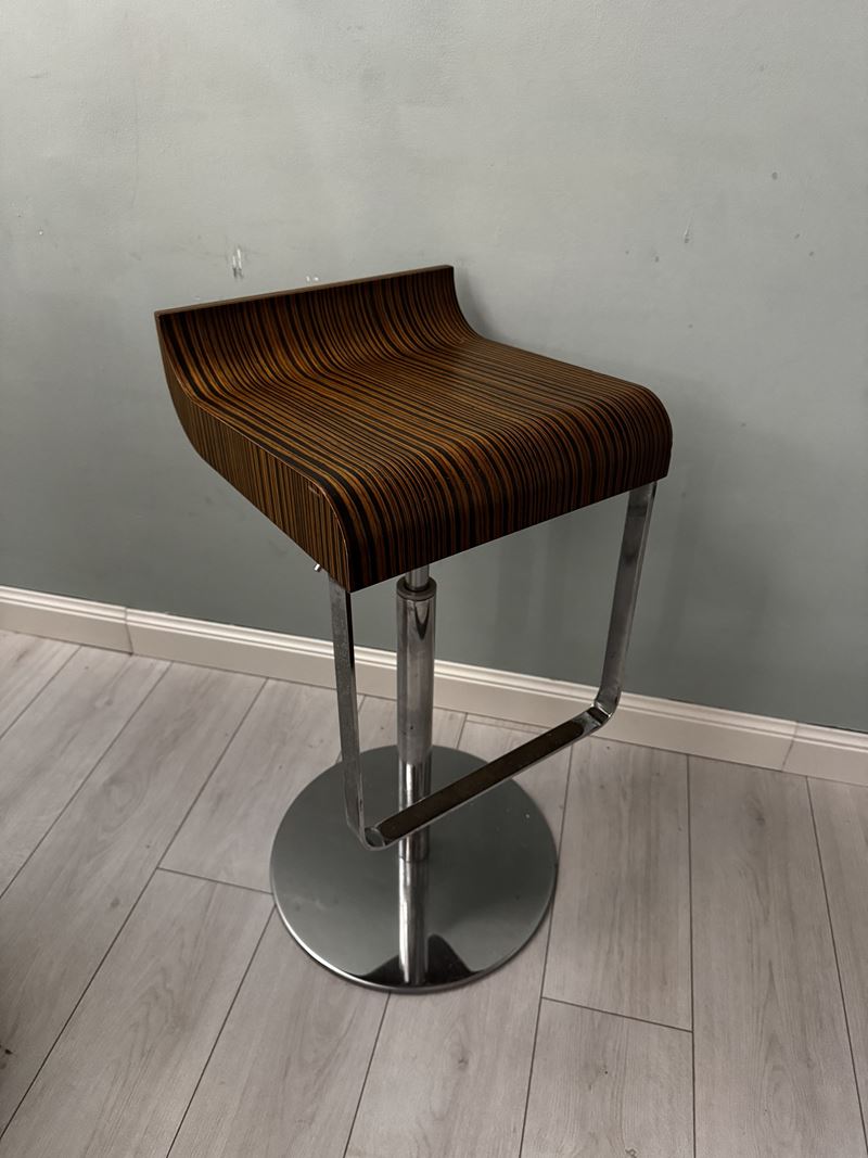 CALLEGARIS Coppia di sgabelli da bar con seduta in legno e base in acciaio. Regolabili in altezza. XXI secolo. Prod. Callegaris, Italia. Cm 90,5x38x37.