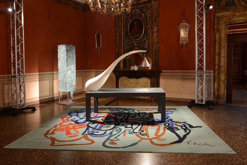SANDRO CHIA (Firenze 1946) Scrivania-scultura "Chia" con acquaforte inserita nel piano, 2010. Scrivania e portalampada in legno laccato opaco; lampada in alluminio e cristallo a filo tavolo di copertura all’acquaforte. Cm 73x200x85. Firma dell'artista. Prod. Cleto Munari, Italia. Pezzo unico: edizione di 9 esemplari.
