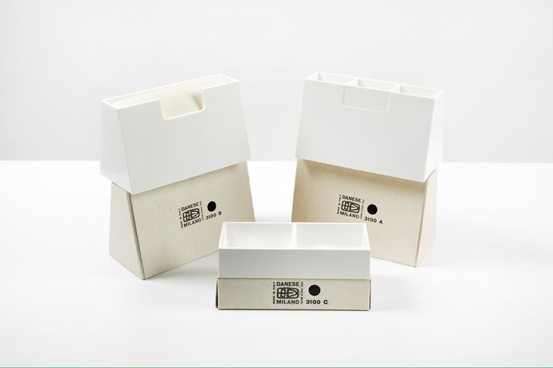 ENZO MARI (Cerano 1932 - Milano 2020) Set da scrivania composto dai modelli "3100A" "3100B" "3100C", in plastica bianca, 1973. Cm 10x16,5; 3,5x16,5. Prod. Danese, Italia. In cofanetti originali. Sotto la base recano marchio Danese, Milano, Made in Italy, Enzo Mari, 1973.