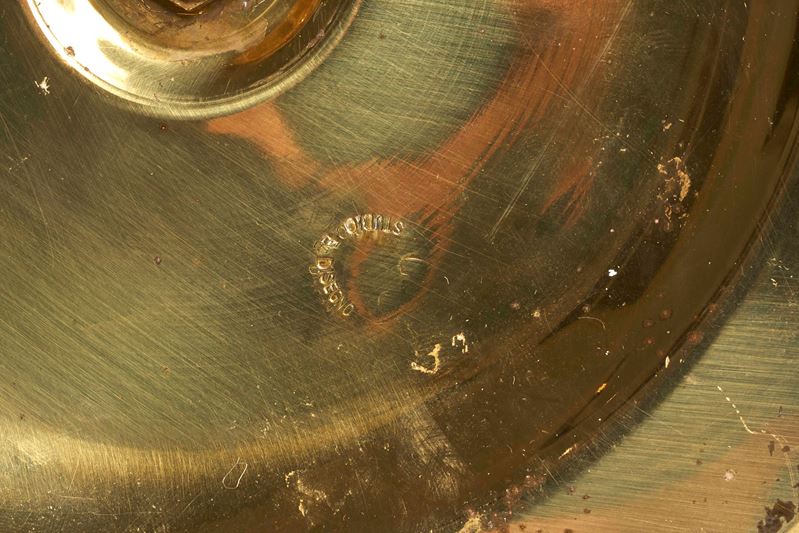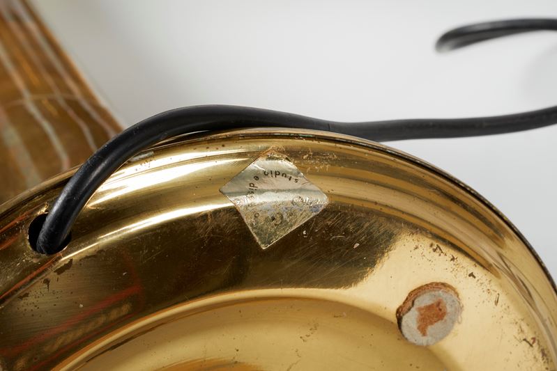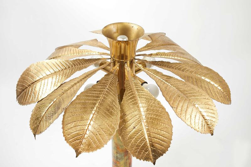 CARLO GIORGI Grande lampada da tavolo modello "Ippocastano alto". Anni '70. Cm 93x86. Lampada in ottone lucido con foglie inserite con viti attorno alle luci in ottone martellato. Prod. Bottega Gadda, Milano, Italia. Reca etichetta e marchio inciso C & G, studio e disegno.